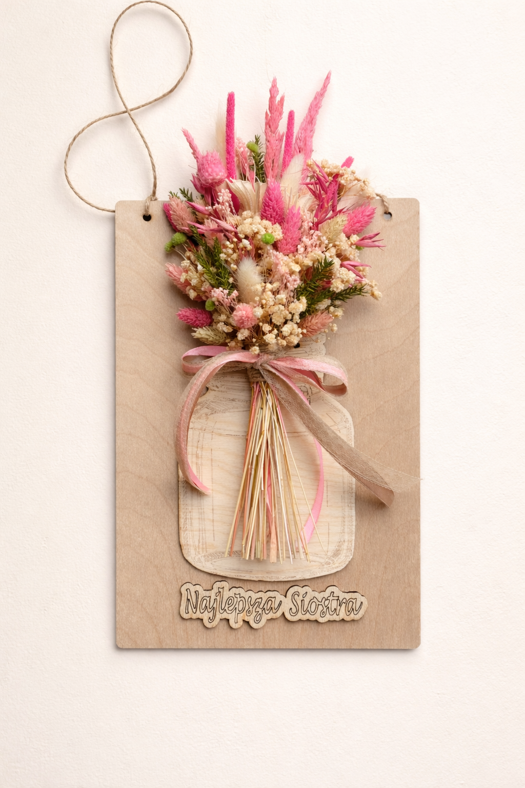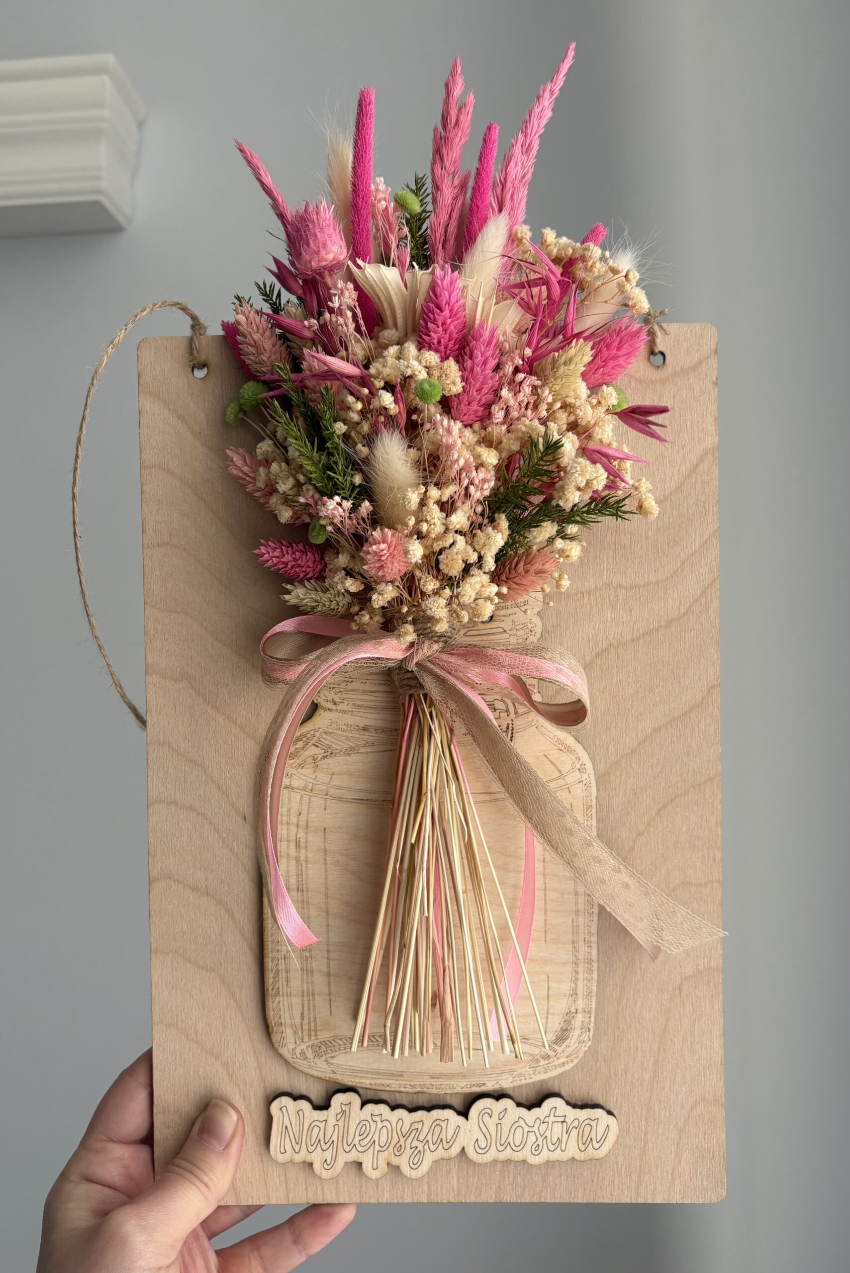 Wyjątkowy bukiet z naturalnego suszu umieszczony na drewnianej desce, który zachwyca formą i trwałością 🌸