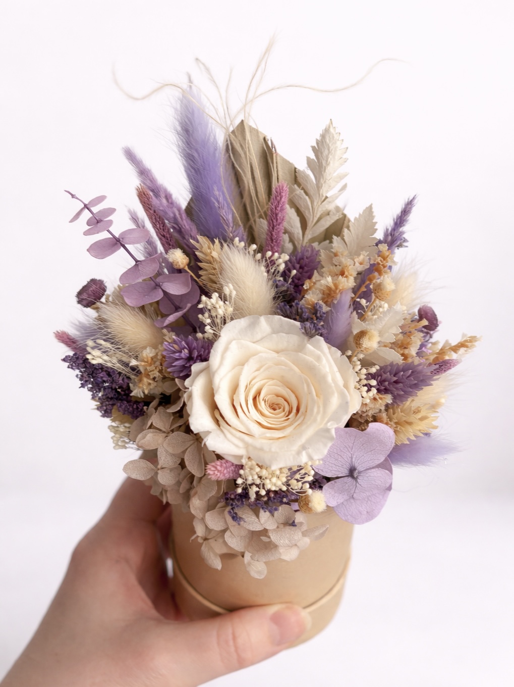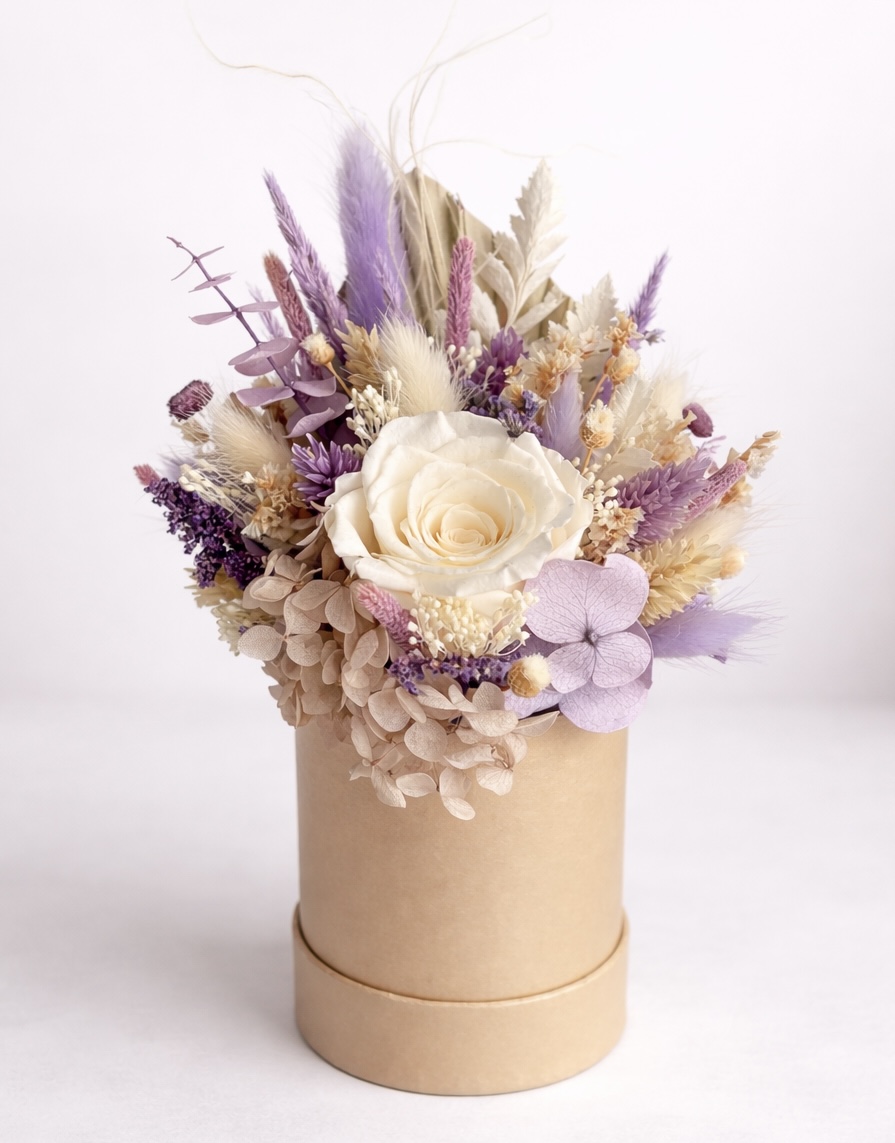 Ten wyjątkowy flower box łączy w sobie delikatność natury i ponadczasową elegancję. W pudełku w odcieniu ciepłego beżu znajduje się wieczna róża w kremowym kolorze, otulona starannie dobranymi suszonymi i stabilizowanymi dodatkami w pastelowych tonach lawendy, fioletu i ecru.