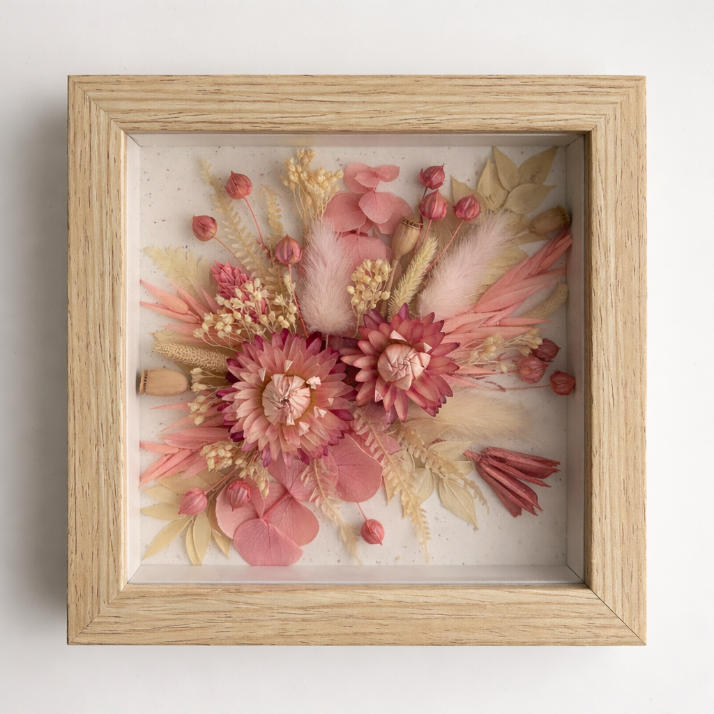Naturalne, suszone kwiaty zamknięte za szkłem tworzą wyjątkową kompozycję 3D. To mały fragment natury zatrzymany w czasie – subtelna, przestrzenna dekoracja, która dodaje wnętrzu ciepła i lekkości.