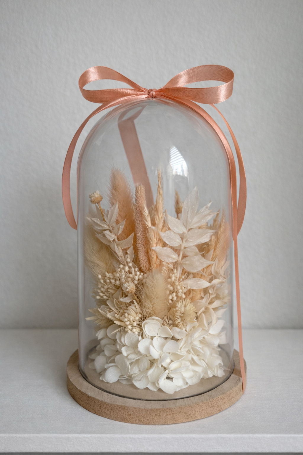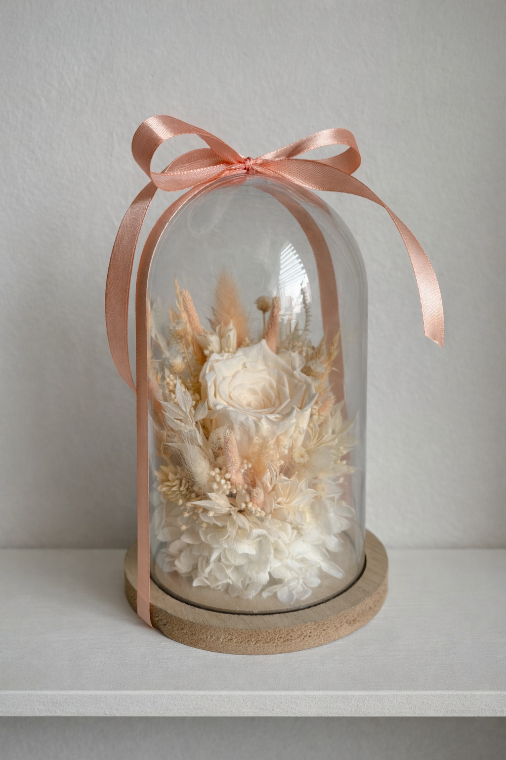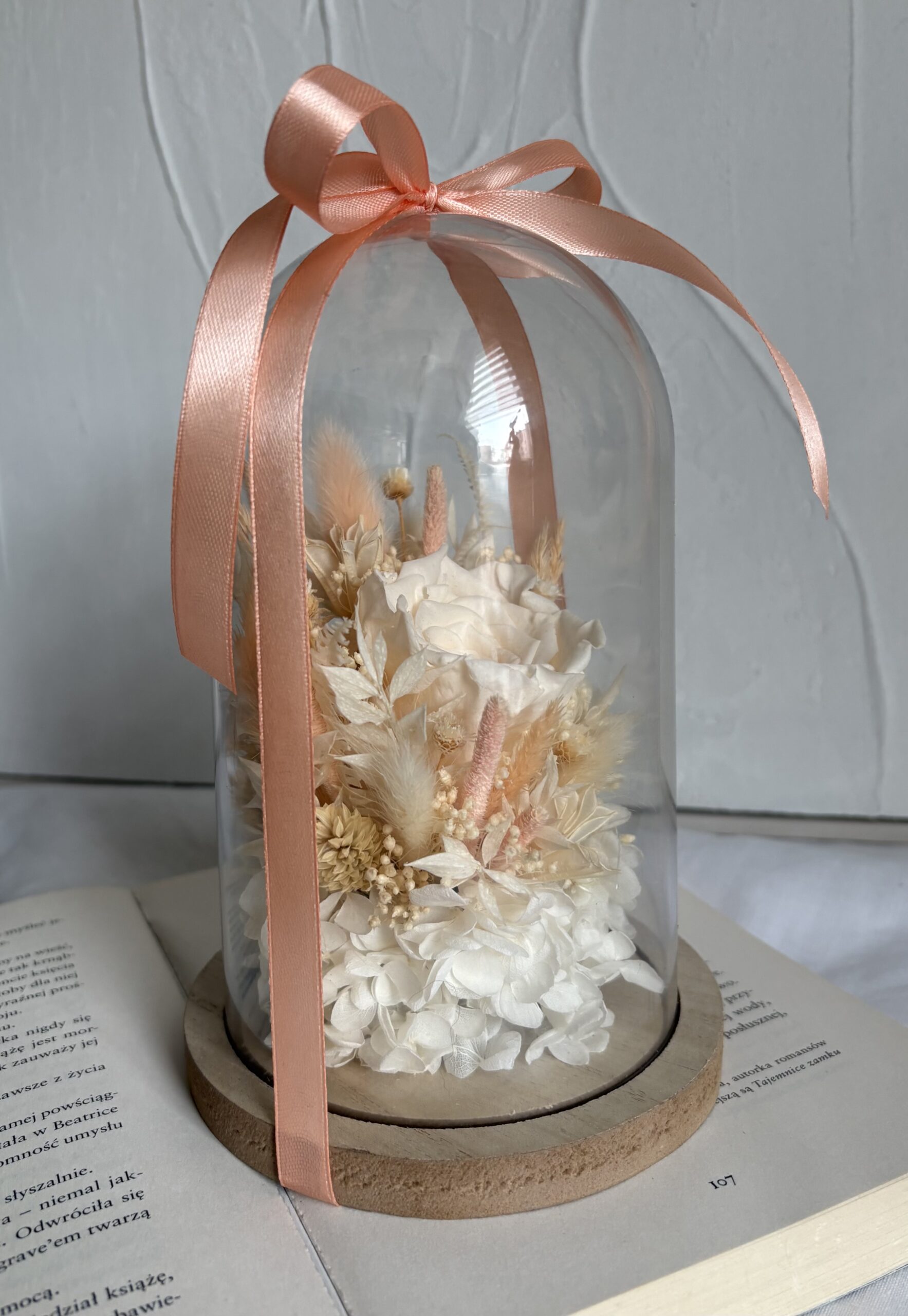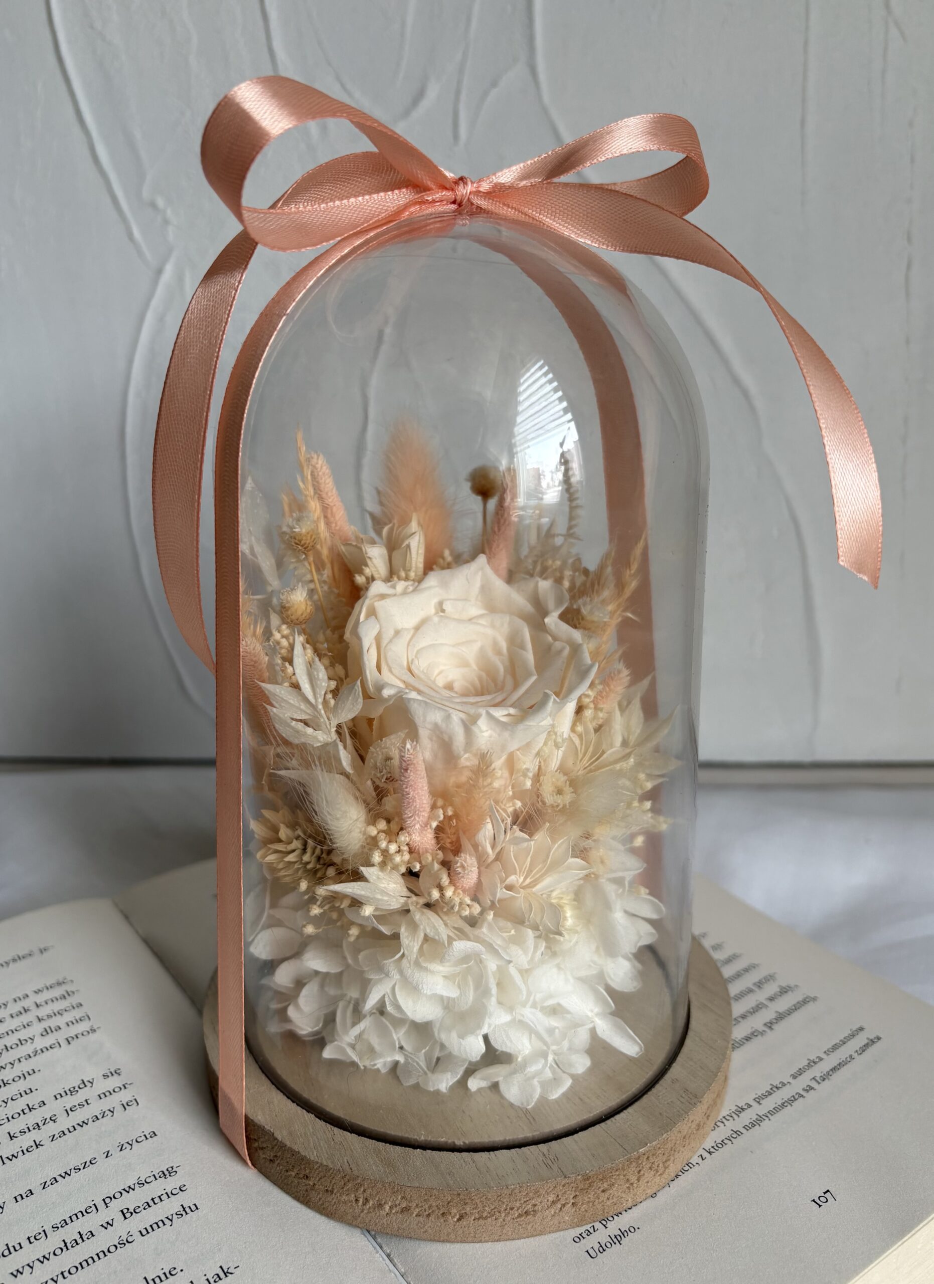 Prawdziwa wieczna róża pod kloszem – wyjątkowa, ręcznie tworzona kompozycja z naturalnego suszu w eleganckich odcieniach beżu, kremu i pastelowej brzoskwini, wzbogacona stabilizowaną hortensją. Ponadczasowa dekoracja, która zachwyca bez potrzeby pielęgnacji. Dostępny tylko jeden egzemplarz – idealny, by podarować coś naprawdę niepowtarzalnego.