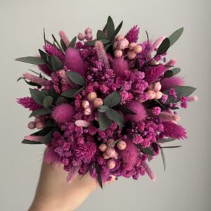 - Dekoracyjny bukiet z suszonych i stabilizowanych kwiatów w intensywnych odcieniach fuksji i różu, umieszczony w klasycznym, różowym flower boxie. Stabilizowana gipsówka oraz eukaliptus zachowują naturalny wygląd i trwałość przez długi czas, nie wymagając pielęgnacji. To idealny wybór na wyjątkowy prezent lub stylową dekorację wnętrza. Wysokość 19cm